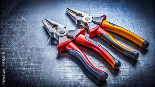 Close-up view of three professional-grade pliers with contrasting colored handles, resting on a textured metallic surface
