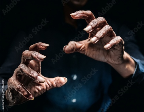 Closeup view of two female old scary mystic hands with long black nails on fingers of witch zomby demon or devil on halloween holiday character in studio indoor on dark background, square picture