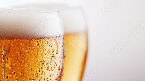 Close-up view of White background with solitary glasses of cold beer. Beer void in space. Hight Resolution.