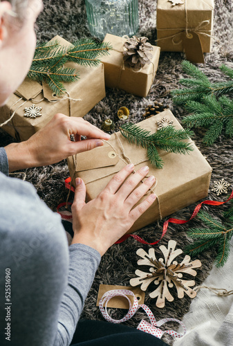 Closeup view of woman preparing ornaments for wrapping a christmas present