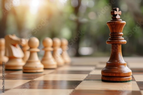 Close-Up View of Wooden Chess King Piece Over a Blurred Outdoor Chessboard Surrounded by Other Chess Pieces