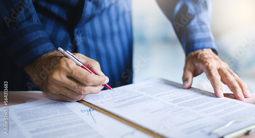 Close-up view on desk office, businessman signing a contract of investment or insurance, legal agreement on the table, Starting successful partnership with entrepreneur or companie, making good deal