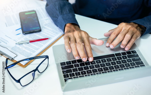 Close-up view, successful businessman, manager or freelancer working on desk at office using laptop, checking work papers and analysis digital chart on mobile