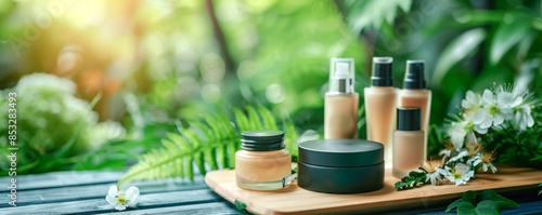 Closeup view to cosmetics on wooden boards. Natural cosmetics concept.