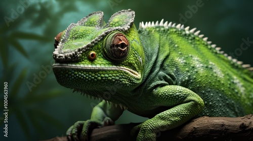 Close-up Vivid Green Chameleon on a Branch with Bokeh Background. Nature Wildlife