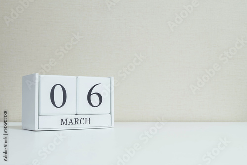 Closeup white wooden calendar with black 6 march word on blurred white wood desk and cream color wallpaper in room textured background with copy space , selective focus at the calendar