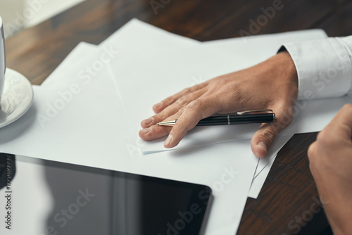 Close-up. Young man. Pen in hand. The tablet. Documentation. Job. Office. A cafe