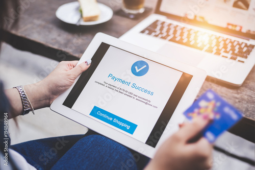 Closeup young woman hands shopping online at home using digital tablet and credit card making payment