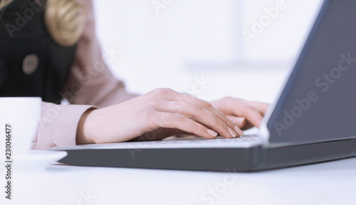 closeup.young business woman working on laptop. photo with copy space