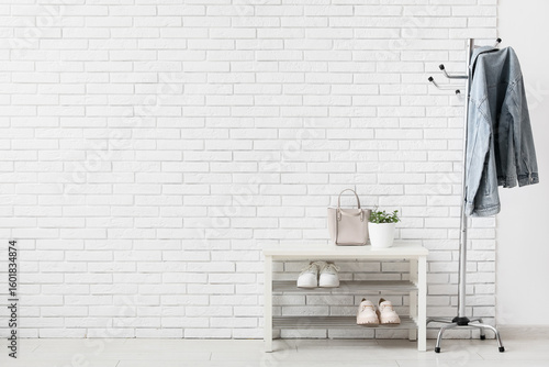 Clothes rack and shoe stand with bag near white brick wall in hallway