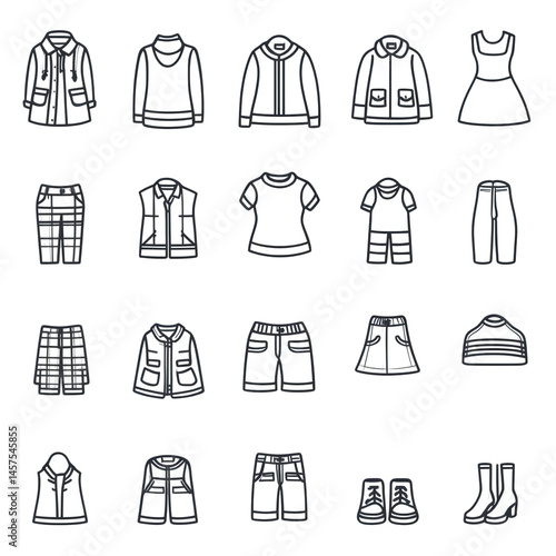 Clothes thin line icons set. Clothes editable stroke icons. Fashion icons. T-shirt, Pants, Jacket, Dress, Short, Shoe, Shirt symbols. Vector --v 6.1 --s 750 --raw