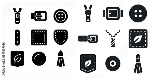 Clothing and accessories silhouette icons set – buttons, zippers, fashion elements