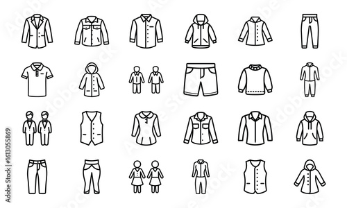 Clothing Line Icon Set – Outline Vector Icons of Shirts, Hoodies, Pants, Suits, Jackets, Dresses, and Uniforms for Men, Women, and Children