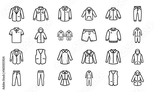 Clothing Line Icon Set – Outline Vector Icons of Shirts, Hoodies, Pants, Suits, Jackets, Dresses, and Uniforms for Men, Women, and Children