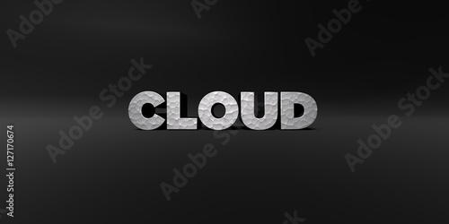 CLOUD - hammered metal finish text on black studio - 3D rendered royalty free stock photo. This image can be used for an online website banner ad or a print postcard.