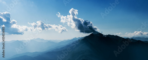 cloud caught on the top of the mountain. Beautiful mountain landscape, clouds over the peaks of the mountains, sunny day