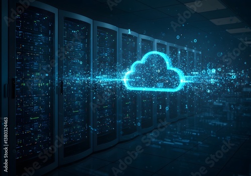 Cloud Computing Data Center Server Racks and Digital Cloud Icon, Secure Storage, IT Infrastructure.