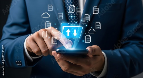 Cloud Computing for Data Synchronization. Person using laptop with Cloud Data Upload and Download, Depicting File Transfer and Secure Digital Connectivity Through Virtual Platforms, Data Management