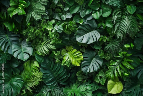 Cloud forest backdrop highlights a vibrant plant wall with dark green foliage and ferns