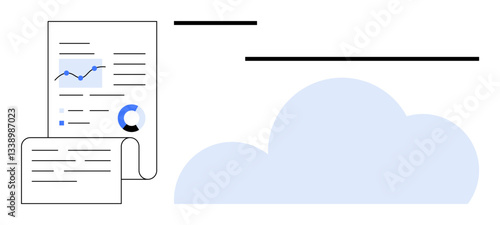 Cloud icon alongside financial documents with graphs, charts, and text. Ideal for data storage, analysis, finance, technology, reporting cloud computing security. Modern flat simple metaphor