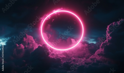 Cloud illuminated with pink neon light ring on dark night sky close-up