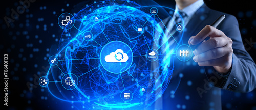 Cloud technology networking processing data storage. Businessman pressing button on screen.
