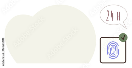 Cloud with fingerprint scanner and 24-hour speech bubble for secure storage and round-the-clock access. Ideal for safety, technology, accessibility, security, cloud computing, authentication, simple