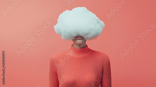 Cloudhead, an imaginative figure with a fluffy cloud for a head stands against a minimalist backdrop, merging surrealism with simplicity.