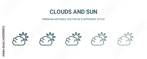 clouds and sun icon in 5 different style. Thin, light, regular, bold, black clouds and sun icon isolated on white background.