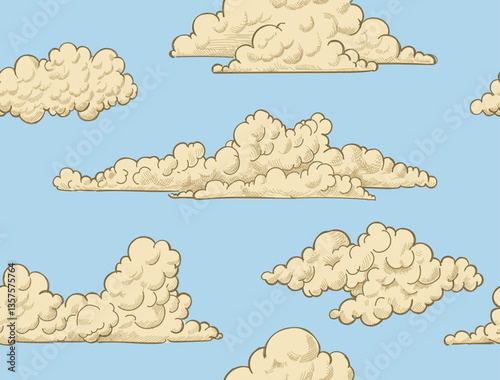 Clouds, sky, seamless pattern vector illustration, hand drawn, sketch, black outline, engraving style