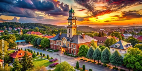 Cloudy cartoon town hall, low light, clock tower, leafy trees.
