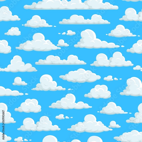 Cloudy sky seamless pattern, clouds background wallpaper. Clouds pattern on abstract blue sky background, fluffy cartoon flat cloudscape, sunny weather nature, easter heaven and kid decoration