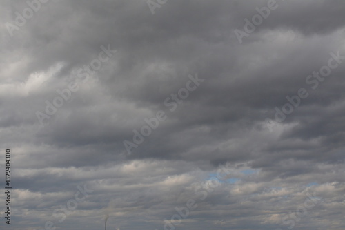Cloudy sky with thick clouds. A small pipe with smoke on the distant horizon
