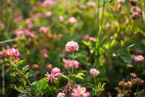 Clover flowers create a colorful display in a green field, basking in sunlight.