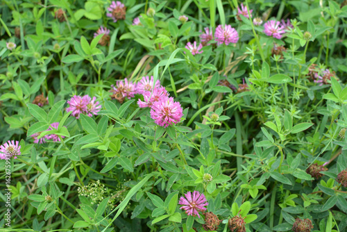 Clover middle (Trifolium medium) blooms in a meadow among grasses