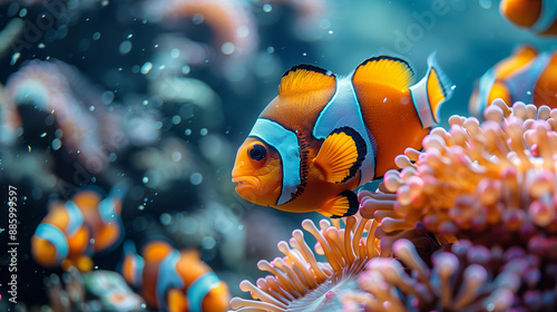 Clown fish with anemone in the deep sea underwater. Anemone fish Nemo background