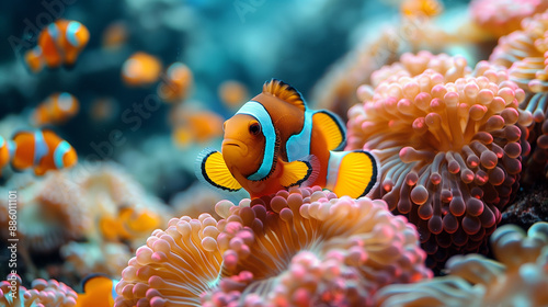 Clown fish with anemone in the deep sea underwater. Anemone fish Nemo background