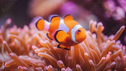 Clownfish Nestled Among Anemones, Showcasing Bright Colors and Intricate Details in Natural Aquarium Lighting