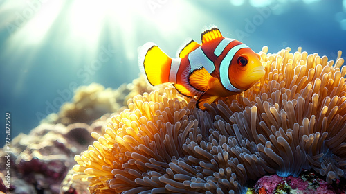Clownfish on anemone in sunlit ocean coral reef; underwater scene for marine life publications
