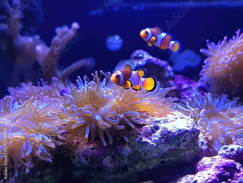 Clownfish swim among anemones in a vibrant underwater coral reef setting