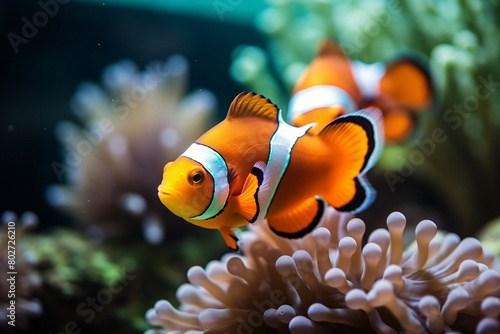 Clownfish swimming in an aquarium with coral and colorful marine life