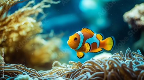Clownfish swimming near coral in underwater sea life scene with colorful aquatic reef marine background