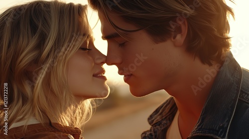 clsoe up portrait young teenager man and woman love couple kissing with sunset light, dreamy romantic love , nostalgia vibes