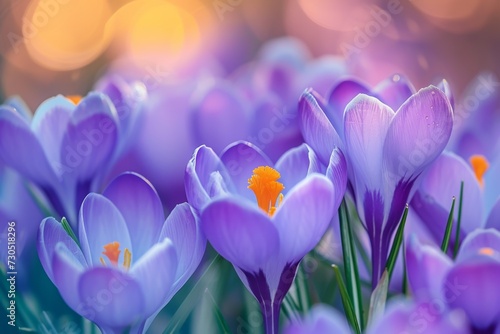 Cluster of crocuses lit by warm spring light, accentuating their rich purple color