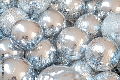 Cluster of Disco Balls Creating a Shimmering Pattern on a Neutral Backdrop, Ideal for Minimalist Artistic Projects and Designs