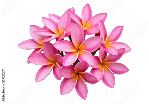 Cluster of fresh pink plumeria flowers with soft yellow centers, isolated on a white background