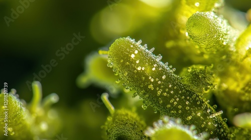 Cluster of germs under a microscope, [germ, biology research, microorganism], [extreme close-up, high detail, soft light]