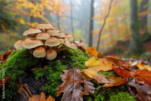 Cluster of mushrooms on a moss-covered log surrounded by autumn leaves in a misty forest, showcasing the beauty of fall foliage and natural growth.