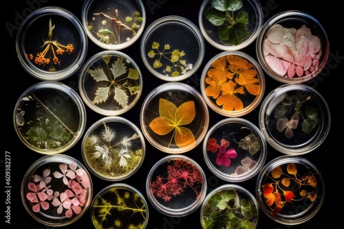 cluster of petri dishes with various cultures growing in parallel, created with generative ai