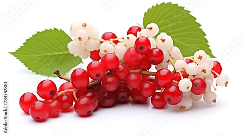 Clusters of red and white viburnum berries with foliage. Luscious viburnum isolated on a pristine white background. Concept of botanical nutrition, fall harvest, and holistic healing.